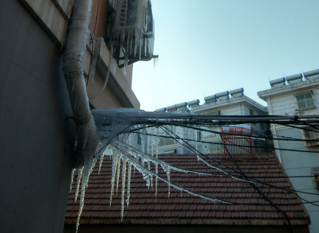 24日下午,淮海農(nóng)場城南15號樓樓頂出現(xiàn)自來水泄漏現(xiàn)象,泄漏下來的水流不僅把二樓墻壁上的空調(diào)凍成了冰凌團子,漏下來的水沿著水管四濺,造成二樓的主樓梯口成了水簾洞,臺階也成了易滑跟頭的冰臺階。無論是空調(diào)還是臺階甚至高懸在頭頂?shù)谋?,都存有極大的安全隱患。