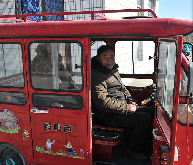 畫面中的駕駛員是淮海農(nóng)場四分場社區(qū)54歲的黃玉青,弱智又低收入的他,每月靠400元的低保維持著簡單的生活。2017年農(nóng)場組織科長林一高和四分場二十八大隊隊長王扣林與其結(jié)成精準幫扶對子后,他在獲得幫扶的同時,也更是激發(fā)了黃玉青自主創(chuàng)業(yè)的動力。黃玉青每天開著一輛百事鑫電動三輪車,停泊在醫(yī)院門前接客,在方便他人的同時,也為自己增加了收入。瞧,載著客人的黃玉青笑得是多么地燦爛。