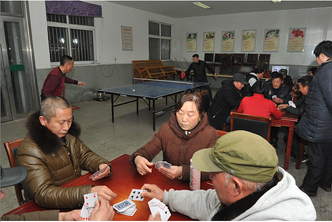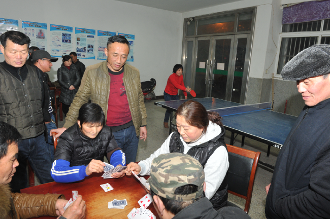 夜晚散步,一跨進位于江蘇農(nóng)墾淮海農(nóng)場城東居委會活動室內(nèi),頓感這里人聲鼎沸,暖意融融。這邊乒乓球在球拍來回推擋中眼花繚亂,抽殺正酣,那邊一溜排開的3張桌子上擠滿了人,玩著爭上游、摜蛋等撲克游戲。