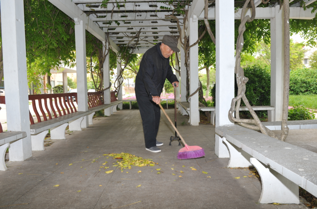 “開(kāi)始掃地時(shí),我把掃帚和簸箕放在綠化叢中,沒(méi)曾想,僅過(guò)了一周,掃地的工具不見(jiàn)了蹤影,以后,我只好每天上午或是中午,提前帶著掃帚簸箕和抹布來(lái)這里揩擦打掃,在其他老人還沒(méi)到來(lái)之前,掃清長(zhǎng)椅地面,揩去鳥(niǎo)蟲(chóng)屎后,再垃圾倒入100米開(kāi)外的垃圾桶中。”楊文才告訴我。