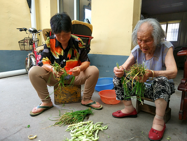 家人買菜回來,老人就會主動地搬起小板凳,坐下來擇菜、掐豆莢、去老葉或剝豆米。有時老人還跑到戶外鄰居家的蔬菜地上去拔草,弄得鄰居直喊,老奶,趕緊不要拔,要是你再有個三長兩短,叫我怎么說得清。