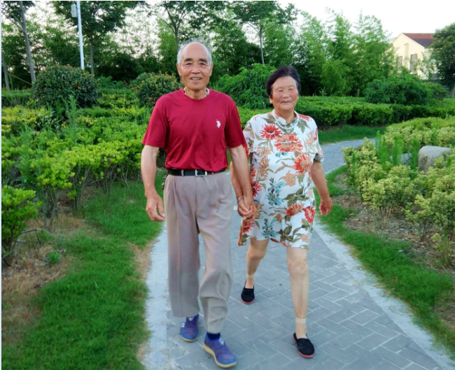 故事的主人公名叫施學兵,今年77歲。妻子叫吳炳如,小他兩歲,他們住在射陽縣淮海農(nóng)場振興小區(qū)一間簡陋的房子里。每天傍晚他倆都要來公園里兜圈,并牽手走上六七公里路程,然后再到公園內(nèi)的器材上拉伸鍛煉,舒展下筋骨,這對恩愛夫妻成為淮海公園內(nèi)的一道美麗風景。