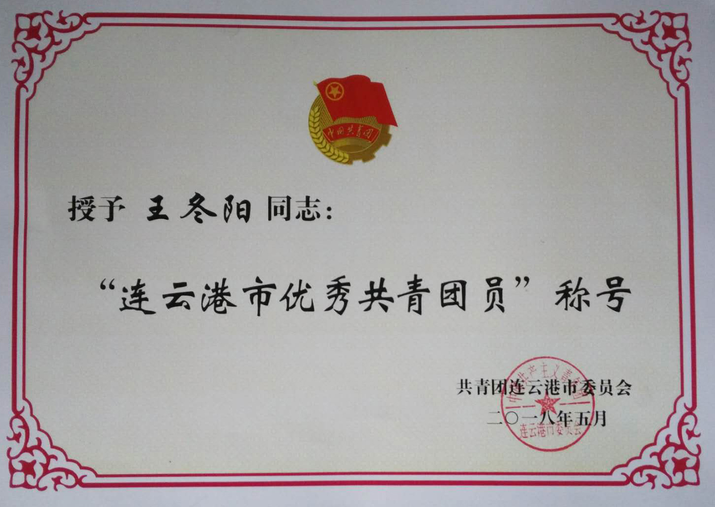 近日,從共青團連云港市委員會傳來喜訊,東辛農(nóng)場社區(qū)東方路居委會干事王冬陽被授予2017年度“連云港市優(yōu)秀共青團員”榮譽稱號。