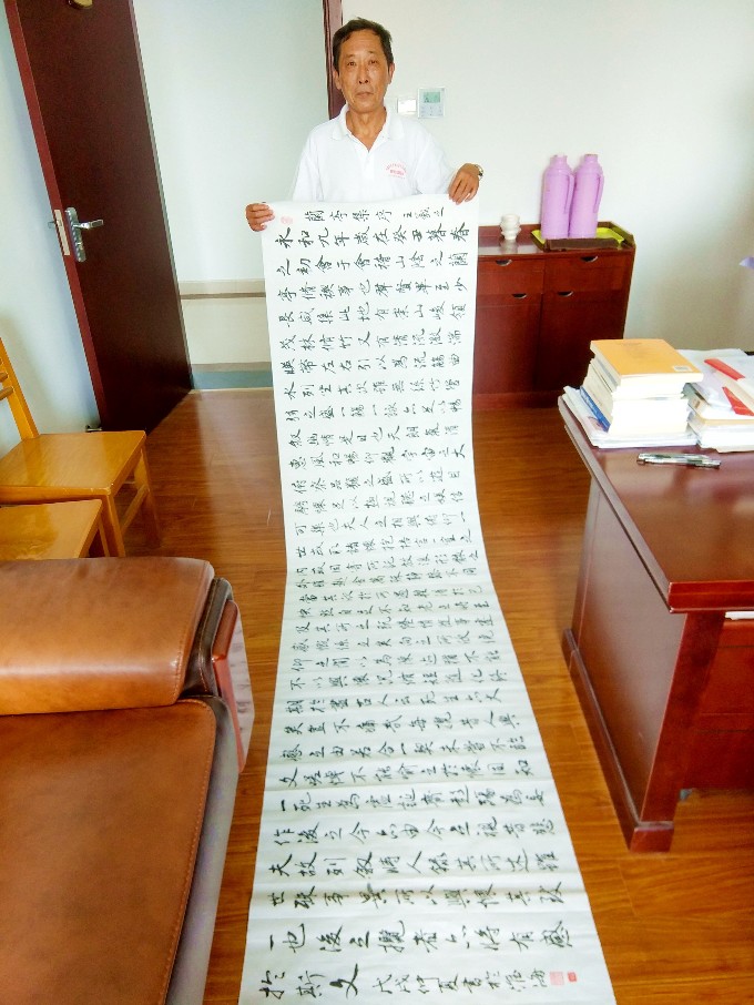 淮海農場中學退休教師陳必祥是中國書畫家協(xié)會理事,多年來他潛心研究書法,作品多次獲得國家和省、市、縣大獎。為了臨摹好王羲之的行書《蘭亭序》書法,陳必祥預先在報紙上把《蘭亭序》上的324個字逐一練習30遍,并在全面掌握其中每一個字體的章法、結構和筆法后,陳必祥用了一天的時間,終于臨摹完成了王羲之的這幅《蘭亭序》作品。