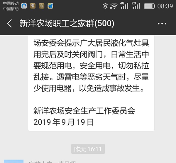 “廣大居民液化氣灶具用完后及時關閉閥門,日常生活中要規(guī)范用電,安全用電,切勿私拉亂接。遇雷電等惡劣天氣時,盡量少使用電器,以免造成事故發(fā)生。 ”9月19日15時45分,新洋農場職工之家群里場安委會發(fā)出了提醒職工們注意出行安全的信息。