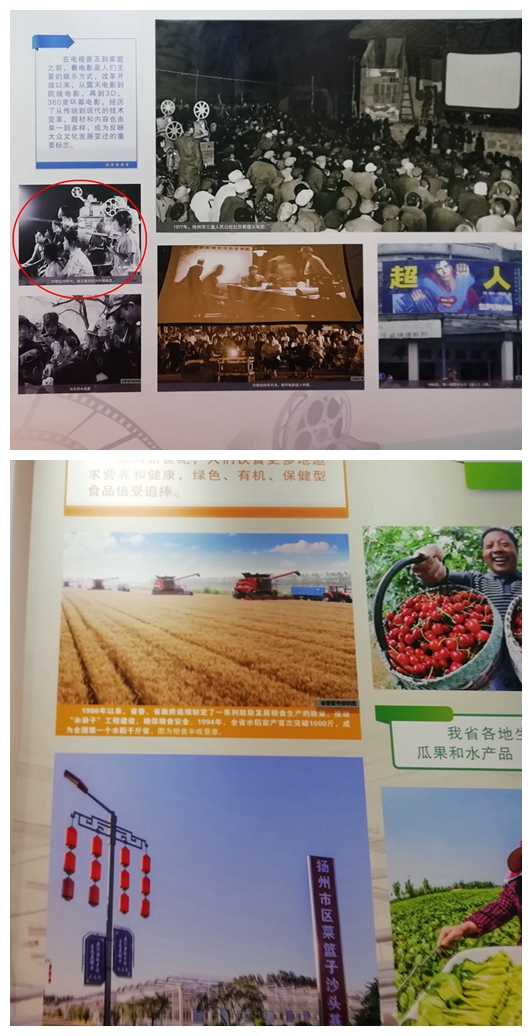 這兩張照片分別入選在“歷史跨越”和“美好生活”兩個(gè)部分中,照片沒有標(biāo)明是新洋農(nóng)場(chǎng)場(chǎng)景,而是從江蘇省宏觀上來(lái)配寫文字說(shuō)明的,說(shuō)明新洋農(nóng)場(chǎng)在某些方面帶有普遍的意義,這是新洋人感到自豪的。