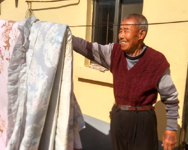 在李朋友家采訪過程中,李朋友的女兒李月春告訴我,她父親也是一個(gè)非常愛干凈的人,不但家里家外收拾的清清爽爽。只要晴天,天天把被子抱出來曬,并且一直堅(jiān)持自己的衣服自己洗,從不要兒女摻和。就是睡的被褥自己來勾,換季床鋪也是自己來開,樣樣事做得是像模像樣,從來不要兒媳她們來搭半點(diǎn)手。沒事時(shí)常拿著掃帚幫助一旁兒子們開的農(nóng)機(jī)修理間打掃衛(wèi)生,就是門前的路上,老人也常拿著掃帚清掃路面,有時(shí)還向兩邊打掃出去有百十米長,讓負(fù)責(zé)這片的環(huán)衛(wèi)工都要感謝他。
