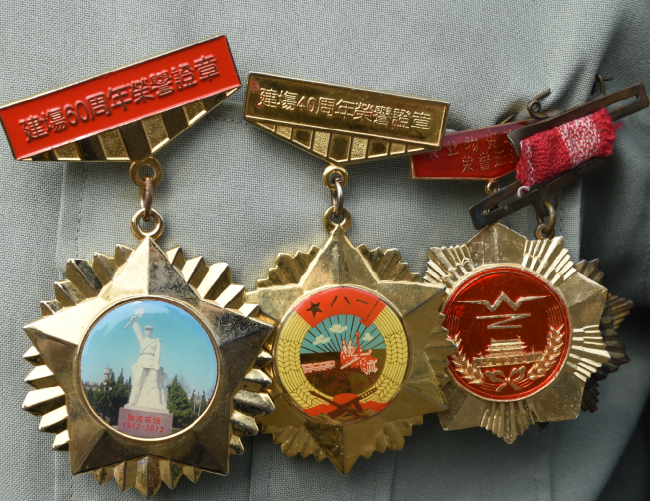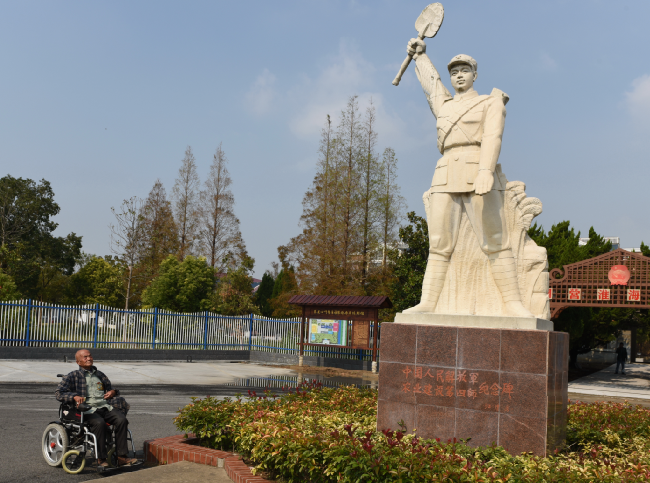 在淮海農(nóng)場農(nóng)建四師戰(zhàn)士紀(jì)念碑下,每天我們都可見到一位老人坐在輪椅上,瞻仰著農(nóng)建四師戰(zhàn)士雕像,因老人胸口常年佩帶像章的緣故,這3枚金質(zhì)像章已經(jīng)略顯褪色,但從老人堅毅的目光中,仿佛在心中期盼著什么。這個人就是城西居委會振興小區(qū)92歲高齡的退休老干部胡鐵成。