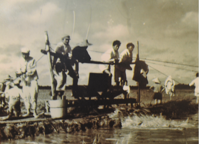 七月二十三日晚上,十二團六連勇士們又出發(fā)了,到一分場場南二十四號至三十六號條田去排除積水。今晚不是戽水,而是用水車車水。大多數(shù)戰(zhàn)士是啟海一帶人,對踏車很生疏。面對著這樣情況,徐文和連長就根據(jù)現(xiàn)有的十三架水車、八十個人,進行科學分工,他決定會踏車與不會踏車的人搭配開來,一架水車六個人,互教互學。