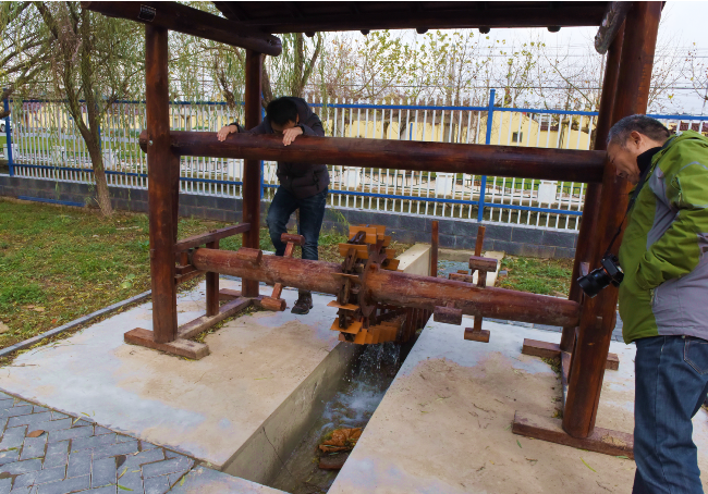 他們干著干著,不覺東方發(fā)白了,天亮了,太陽出來了??纯刺镩g積水,已減低二寸多,綠綠的棉苗露出頭來,大家高高興興的收兵回家,一路上說的笑的都是一句話:我們有把握戰(zhàn)勝自然,使棉苗脫險,并生長旺盛!圖為當年農(nóng)建四師戰(zhàn)士在踏水車排水和在農(nóng)建四師暨淮海農(nóng)場歷史陳列館互動區(qū)展示出來的水車原型。