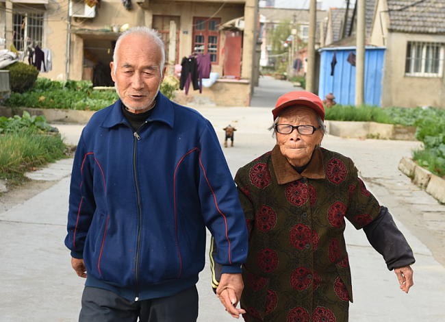 在淮海農(nóng)場(chǎng)社區(qū)振興小區(qū),我們常常可以在農(nóng)場(chǎng)社區(qū)的廣場(chǎng)、菜市場(chǎng)、馬路上看到有這么一對(duì)頭發(fā)花白的夫婦,丈夫總是在前邊走,妻子躬著腰在身后三五米遠(yuǎn)跟著。如果你認(rèn)為是丈夫不等妻子一起走那可是大錯(cuò)特錯(cuò)了,其實(shí)這是源于妻子視力差,所以跑步時(shí),丈夫總是在前面用自己的身影給老伴帶路,這種一前一后如影相隨的鏡頭并形成特色,并定格在淮海人的心間,并稱贊他們是相濡以沫的模范夫妻。這對(duì)夫婦就是農(nóng)場(chǎng)社區(qū)86歲的錢德明和83歲的姚靜珍夫婦,他們已經(jīng)一起攜手走過(guò)了60多年。