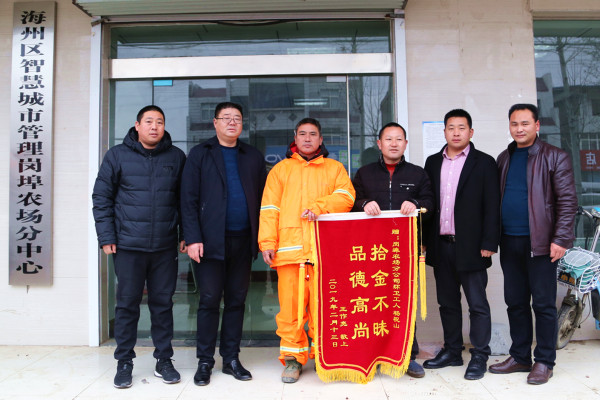 “感謝,非常感謝!”2月14日上午,家住東??h白塔埠鎮(zhèn)董園村村民王作亮將一面寫著“拾金不昧 品德高尚”的錦旗,送到了崗埠街道環(huán)衛(wèi)辦環(huán)衛(wèi)工楊祝山的手中,不停地表示感謝。
