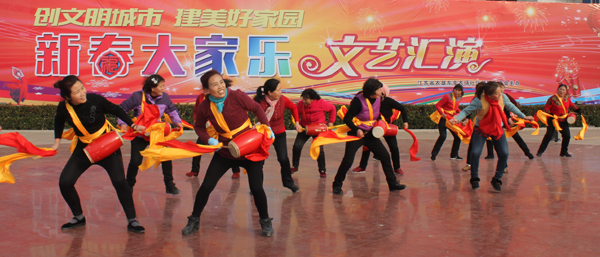 (圖為東辛職工群眾在新春大家樂活動(dòng)中表演腰鼓)