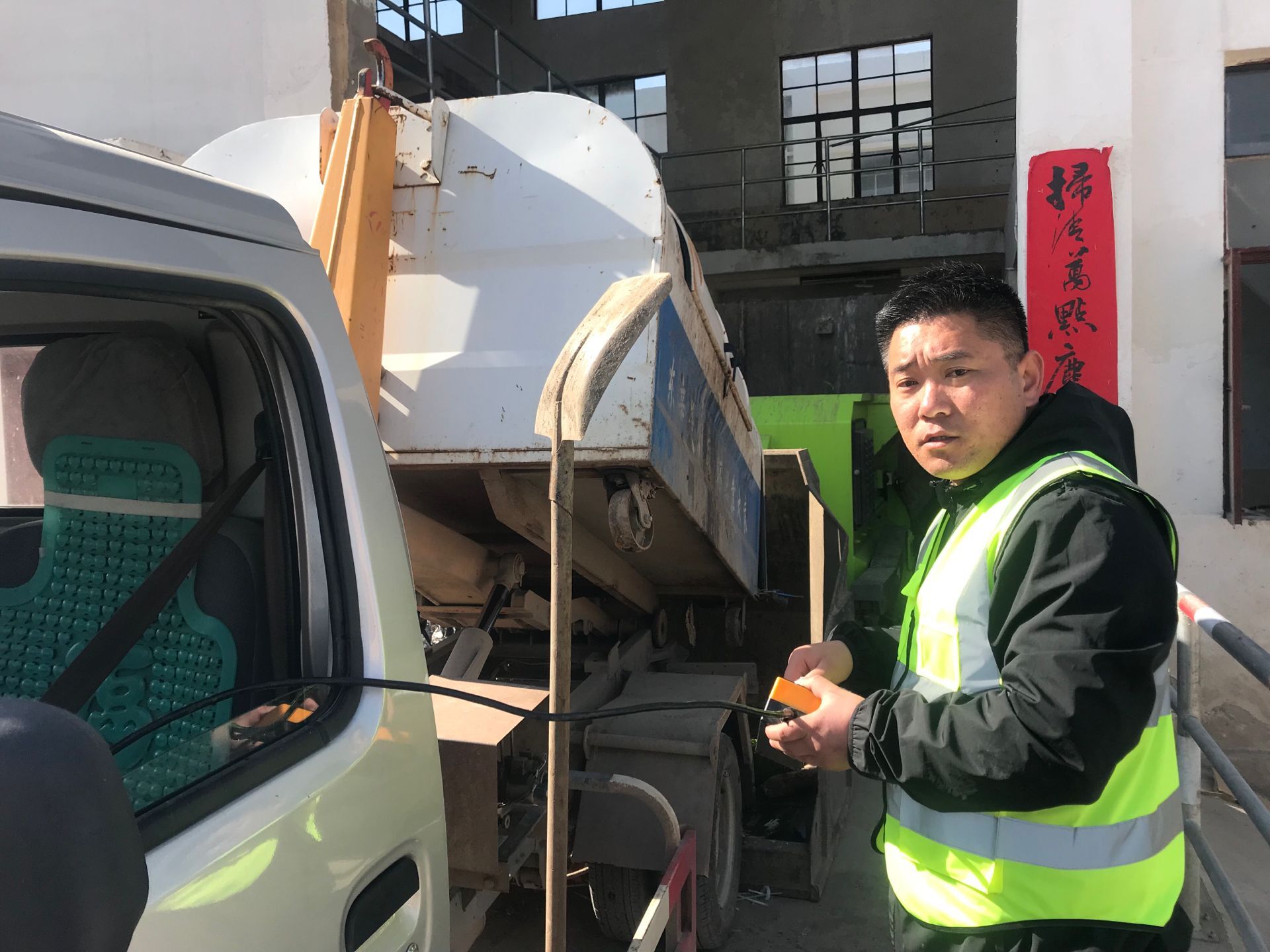 (圖為東辛環(huán)衛(wèi)綠化所徐雷正在檢修垃圾運(yùn)輸車)