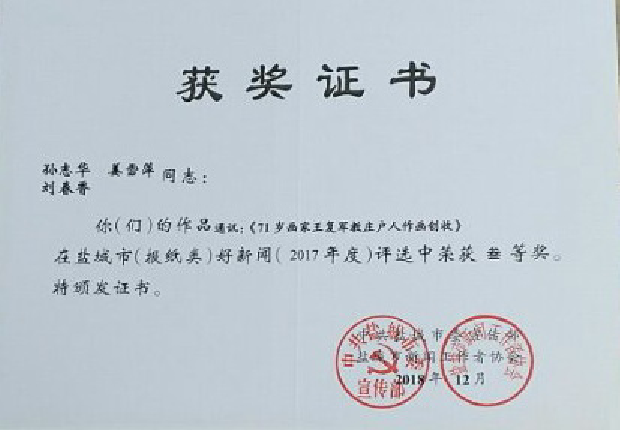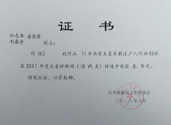 4月9日下午,淮海農(nóng)場有限公司通訊員姜雪萍、劉春香等陸續(xù)收到了郵遞員送來的獲獎信件,由孫志華、姜雪萍、劉春香合寫的《71歲畫家王復(fù)軍教莊戶人作畫創(chuàng)收》通訊稿,2018年5月,被江蘇省新聞工作者協(xié)會評為2017年江蘇省好新聞叁等獎;同時這篇通訊稿在2018年12月,被中共鹽城市委宣傳部、鹽城市新聞工作者協(xié)會在報紙類(2017年度)好新聞評選中也榮獲了叁等獎。圖為獲獎證書。