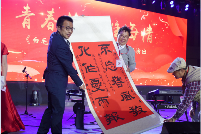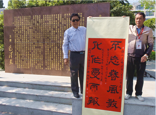 4月18日在淮海農場文化廣場舉行的青春夢、淮海情《白毛女》劇組重回第二故鄉(xiāng)專場演出活動上,原淮海農場紅旗分場十四連的蘇州知青,近70歲的畢培華特地書寫了一幅“不忘春風教 化作夏雨報”裝裱好的書法豎軸,為《白毛女》劇組時隔五十年重回淮海農場演出助興。圖一為畢培華在舞臺上捐贈書法豎軸;圖二為畢培華和老友在毛澤東發(fā)布的“生產待命、建設農場”命令碑文前展示豎軸書法時的鏡頭。