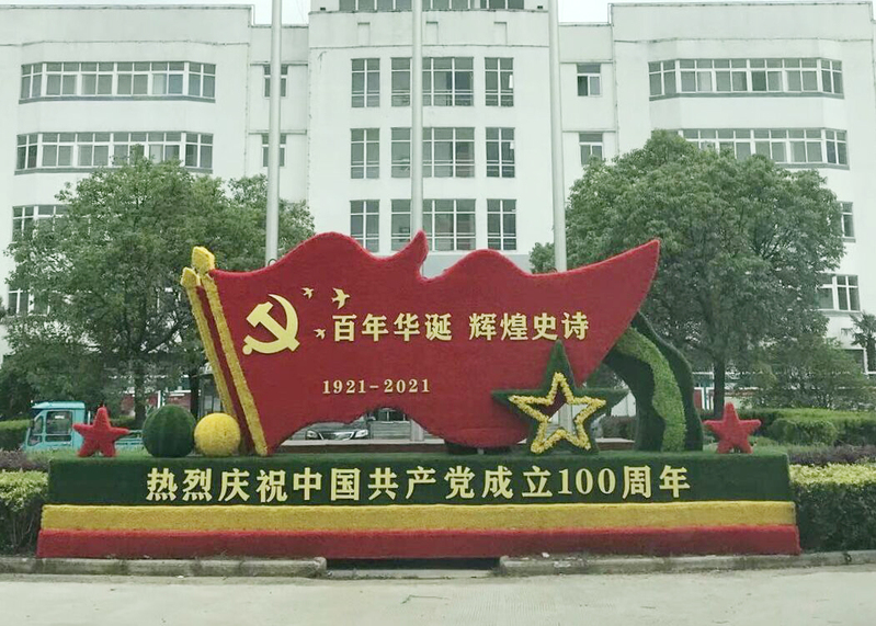早在5月份,一組熱烈慶祝中國共產(chǎn)黨成立100周年的綠雕就將辦公樓前的花壇裝點一新。根據(jù)慶祝建黨100周年氛圍營造方案,近期,施工人員抓緊對350省道小城鎮(zhèn)段、裕源大道、建場路的燈桿上安裝印有“中國夢”字樣的中國結(jié)景觀燈,同時穿插“不忘初心,牢記使命”、“砥礪奮進,追夢前行”、“聽黨話,跟黨走”以及企業(yè)精神的道旗和宣傳標語等,營造出一派紅色、熱烈、喜慶、向上的濃厚氛圍。