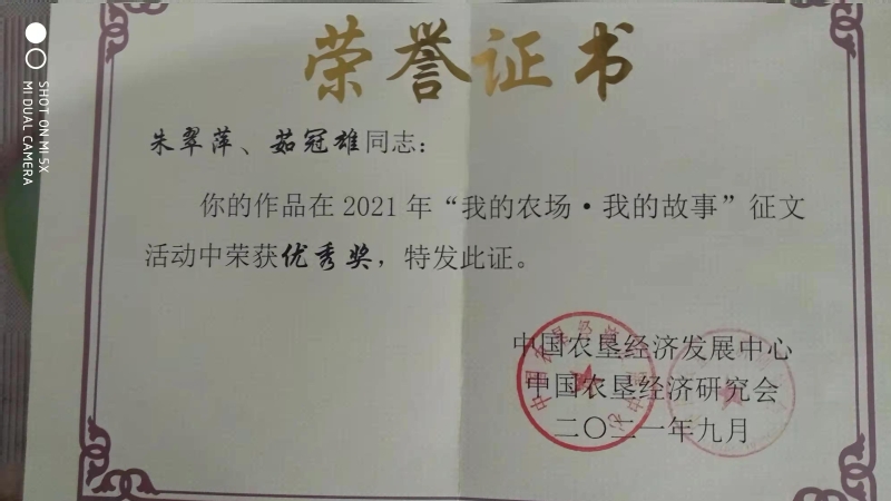 近日,弶港農(nóng)場(chǎng)杜鵑居委會(huì)黨員朱翠萍、茹冠雄夫婦收到了中國(guó)農(nóng)墾經(jīng)濟(jì)發(fā)展中心,中國(guó)農(nóng)墾經(jīng)濟(jì)研究會(huì)寄來(lái)的2021年“我的農(nóng)場(chǎng),我的故事”征文獲獎(jiǎng)榮譽(yù)證書。