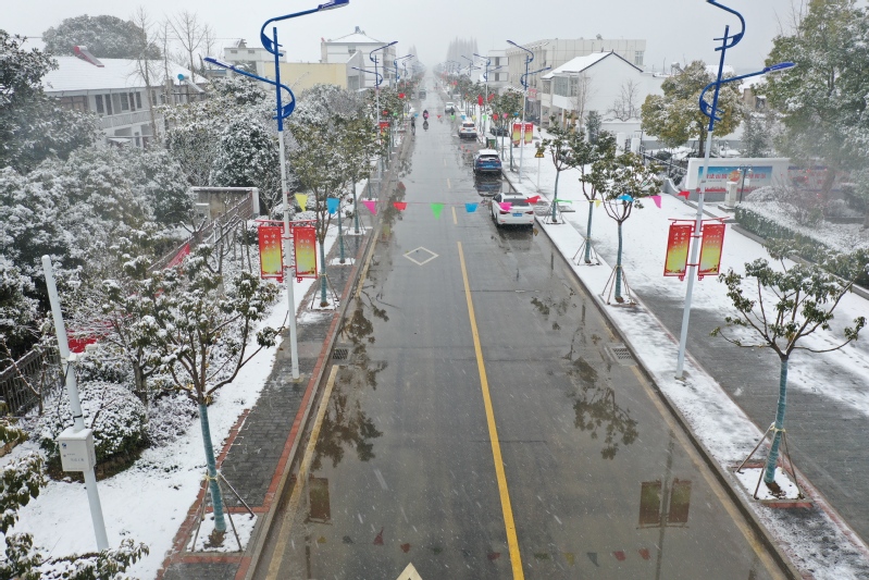 高大的銀杏樹、柿子,落光了葉子的枝杈上,一條條毛茸茸、亮晶晶的銀條兒好像蟄伏著的蠶蟲;修長(zhǎng)的香樟、低矮的柏樹,四季常青枝葉上一朵朵蓬松松、沉甸甸的雪球,仿佛舉起的棉花糖。“呼……”一輛晨起的公交車閃著光駛過,一面面紅旗也迎風(fēng)雀躍起來,似乎在說“又是一個(gè)豐收年”。