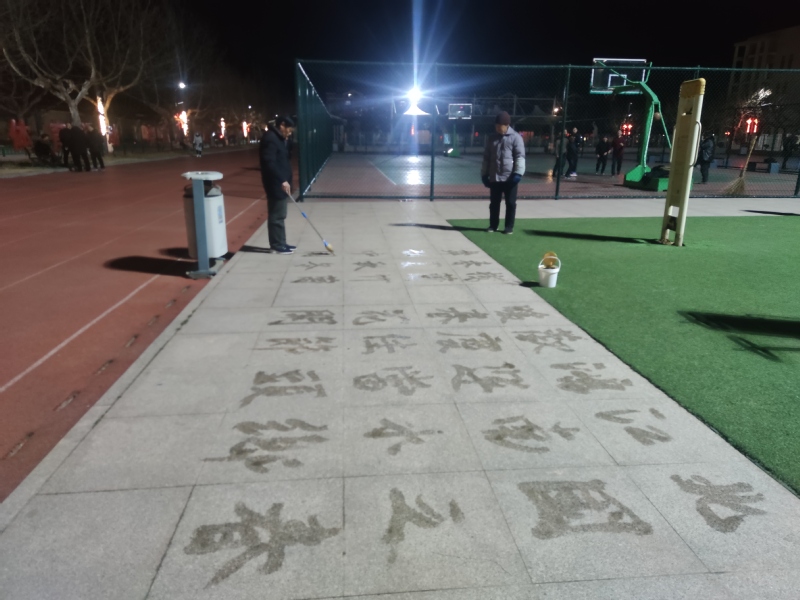 在淮海職工休閑體育運(yùn)動(dòng)廣場(chǎng)上,我們?cè)谝雇頍艄庀略趶V場(chǎng)散步時(shí),經(jīng)??梢钥吹揭粋€(gè)中年人正在專(zhuān)心致志地在廣場(chǎng)大理石的地面上寫(xiě)地書(shū)。只見(jiàn)他用一種如椽大筆在大理石上書(shū)寫(xiě)著,這種地書(shū)筆有長(zhǎng)長(zhǎng)的桿子,用海綿做成的特殊筆頭,既能方便環(huán)保,又不用紙墨,只是用一個(gè)小桶拎著水,就可以蘸水在地上寫(xiě)字。