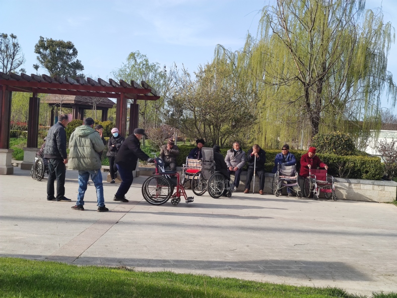我們發(fā)現(xiàn),來這里休憩的老人中,推著輪椅來的老人特別的多,這些老人中,有自己轉(zhuǎn)著輪椅過來的,也有兒女推著他們過來的。“我爸總是讓我將他推到公園中來,他就喜歡與同齡人在一起熱鬧熱鬧,這樣他的心情才舒暢?!焙F成的兒子將老人推到公園坐椅著時(shí)對(duì)我說,“老人怎么說怎么好,我們做兒女的,滿足下他們的心愿就好了。圖為老人們?cè)谝黄鸾徽剷r(shí)的鏡頭。