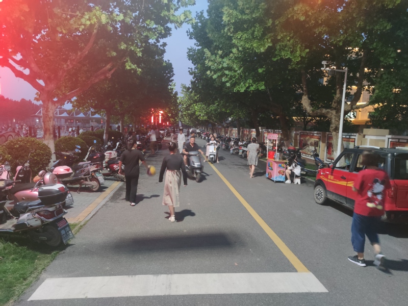 筆者站在廣場的門前看了一會(huì)兒后發(fā)現(xiàn),盡管每天傍晚來這里健身的人流有上千人,創(chuàng)業(yè)路一旁的電瓶車、摩托車車位也十分緊張,但我注意到,許多駕著小轎車來的居民,將車停放在寬闊的淮海路一側(cè)的車位上,不盲目駛往創(chuàng)業(yè)路上有限的小車位,而大多數(shù)開著輕便車輛的居民,看到出入口旁兩側(cè)車子較多的情況下,也會(huì)去很遠(yuǎn)的地方停車再跑回來,大家都能做到文明自覺,給他人方便,也是給自己方便。圖為有序停放的車輛。