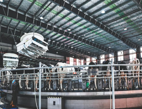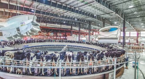 在連云港市東辛農場萬頭牧場內,兩臺80位轉盤式奶牛擠奶設備正在運行,科學擠奶方式既降低了人力成本,更使擠奶效率大幅提高,全程機器操作,避免人工污染,從源頭保障奶品品質。