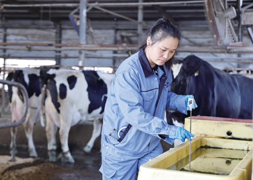 冬季低溫易引發(fā)肺炎威脅奶牛健康。春節(jié)期間,江蘇農(nóng)墾東辛農(nóng)場獸醫(yī)組技術(shù)人員實(shí)行24小時(shí)值守,密切關(guān)注牛只咳嗽、呼吸急促等疑似肺炎癥狀,及時(shí)采取隔離觀察和治療措施,全方位為奶牛健康服務(wù)。圖為技術(shù)人員檢查奶牛健康狀況。 劉興 攝