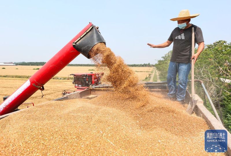 5月28日,江蘇農(nóng)墾三河農(nóng)場職工在裝車收割的小麥。新華社發(fā)(許昌銀攝)