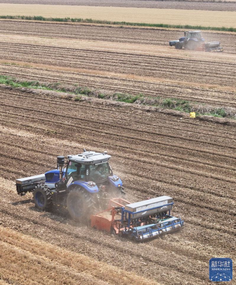 5月28日,揚州大學研制的“九合一”稻麥耕播機在三河農(nóng)場播稻種(無人機照片)。新華社記者 季春鵬 攝