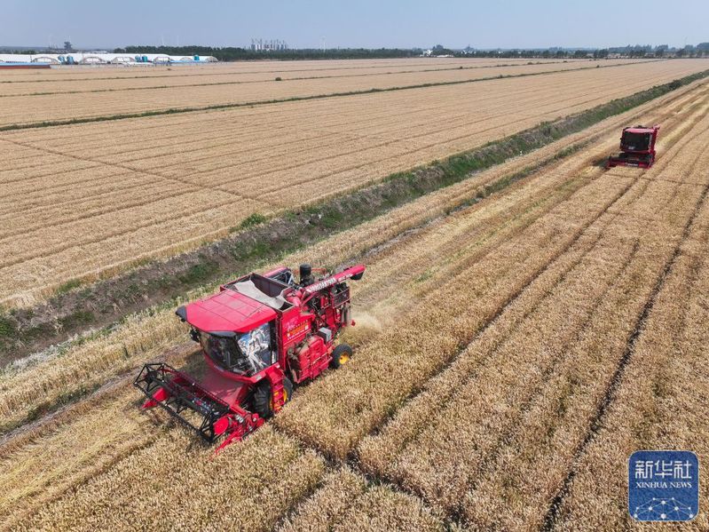 5月28日,收割機在三河農(nóng)場收割小麥(無人機照片)。新華社記者 季春鵬 攝