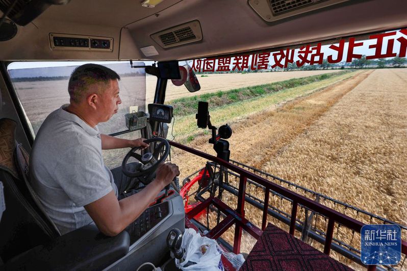 5月28日,江蘇農(nóng)墾三河農(nóng)場農(nóng)機手操作收割機收割小麥。新華社發(fā)(許昌銀攝)