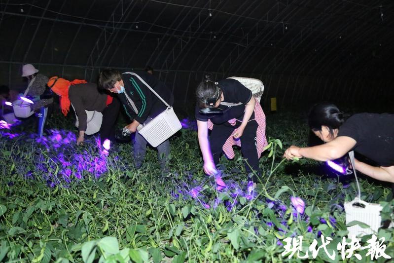 “搜尋時(shí)一定要仔細(xì),左右兩邊都得留意,才能把豆丹抓全?!眴误w2號(hào)大棚的豆丹養(yǎng)殖負(fù)責(zé)人李加祥一邊熟練地捕捉豆丹,一邊向工作人員傳授經(jīng)驗(yàn),“豆丹和豆葉顏色相近,白天捕捉極易遺漏。但到了夜間,紫光燈一照,豆丹就像會(huì)發(fā)光的螢火蟲(chóng),清晰可見(jiàn),不僅抓捕效率高,還能做到顆粒歸倉(cāng)?!睘榇_保此次捕捉行動(dòng)順利開(kāi)展,園區(qū)提前規(guī)劃,從人員調(diào)配到工具準(zhǔn)備,每一個(gè)環(huán)節(jié)都精心部署,為高效捕捉打下堅(jiān)實(shí)基礎(chǔ)。