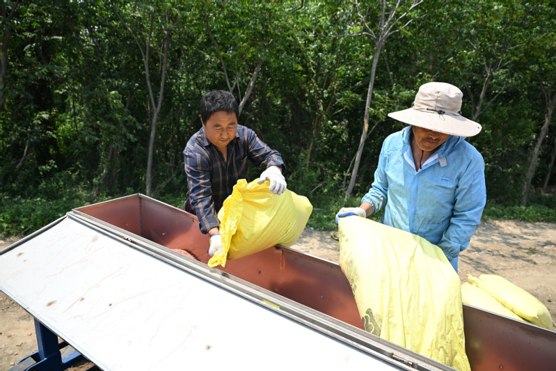 5月28日、「9機(jī)能一體型」稲?麥用耕運(yùn)播種機(jī)にもみを補(bǔ)充する三河農(nóng)場の職員。(盱眙=新華社記者/季春鵬)