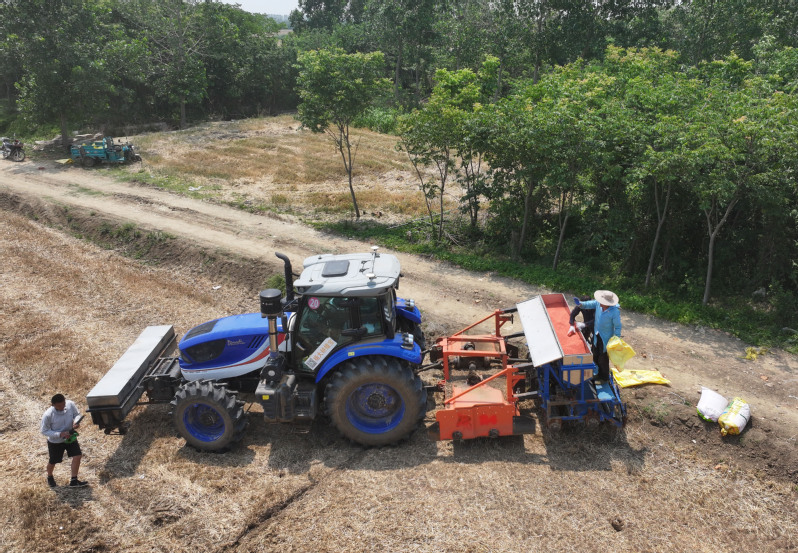 5月28日、「9機(jī)能一體型」稲?麥用耕運(yùn)播種機(jī)にもみを補(bǔ)充する三河農(nóng)場の職員。(ドローンから、盱眙=新華社記者/季春鵬)