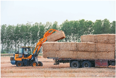 在江蘇省連云港市海州區(qū)的江蘇農(nóng)墾崗埠農(nóng)場,農(nóng)民在田間打捆回收小麥秸稈,進行集中轉(zhuǎn)運堆放。