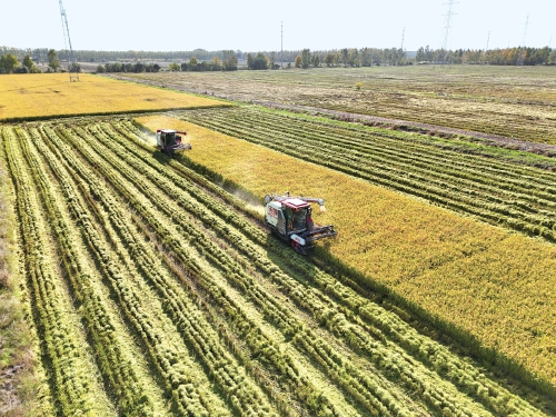 近日,在江蘇省連云港市海州區(qū)江蘇農(nóng)墾崗埠農(nóng)場的高標(biāo)準(zhǔn)農(nóng)田里,職工們利用晴好天氣,積極開展水稻搶收工作,確保不誤農(nóng)時、顆粒歸倉?! ⌒煨l(wèi) 攝