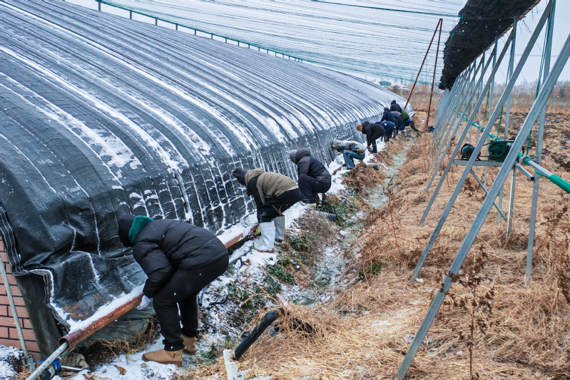 面對大風和積雪壓力,設施結構的穩(wěn)固是第一道關卡?!耙?、二、三!大家不要松手,再加把勁?!?月18日一大早,為應對寒潮,高效農(nóng)業(yè)示范園第一時間組織人員對園區(qū)內所有大棚進行全面加固。同時,對保溫棉被進行檢修和更換,確保其保溫性能處于最佳狀態(tài)。同樣,在云臺農(nóng)場云水灣景區(qū),技術團隊也提前完成了所有生產(chǎn)大棚的結構檢查與加固,重點提升設施的物理抗逆能力,云水灣景區(qū)負責人崔婷婷介紹道,“所有棚室的通風口均已提前密封,并儲備了充足的專用保溫被,用于夜間覆蓋以有效蓄熱。例如在藍莓種植區(qū),我們特別采取了‘雙層覆膜+加厚保溫被’的強化方案,全力鎖住溫度。工作人員也加強了監(jiān)控和維護,確保農(nóng)作物的健康生長?!?/p>