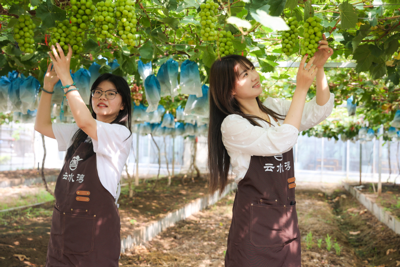 8月3日,在射陽縣淮海農(nóng)場高效園區(qū)5畝連棟高架大棚葡萄園內(nèi),碩大成串的葡萄綴滿枝頭,就連空氣中也彌漫著沁人心脾、清新的水果味,經(jīng)過園區(qū)工人的精心培育,一串串綠色或黑色晶瑩的葡萄掛在藤架上,令人垂涎欲滴。入口品嘗,個個飽滿多汁,甜而不膩。慕名來采摘觀光的游客,在葡萄園內(nèi)一邊抬頭觀賞、一邊低頭采摘(如圖),幸福的滋味綻放在臉龐。在葡萄園里,剛剛用微信掃碼后的淮海居民吉長明興奮地說:“我每年都要來到園區(qū)買幾箱葡萄,這里的葡萄不僅口感好,果也大,讓城里的人也來嘗嘗我們農(nóng)場獨(dú)特的‘土特產(chǎn)’?!睋?jù)他講,每年城里的親朋好友每到這個季節(jié),就要托他買幾箱葡萄帶到城里去。據(jù)了解,園內(nèi)種植品種“夏黑”和“陽光玫瑰”等葡萄品種,畝產(chǎn)量可達(dá)4000斤上下。特別是其統(tǒng)一施用農(nóng)家肥、無公害防蟲防病、反光膜覆蓋、科學(xué)滴灌、疏果等措施,輔助于智能化的通風(fēng)調(diào)溫、噴淋調(diào)水和調(diào)節(jié)光照設(shè)施的開展,合理調(diào)節(jié)土壤水分,降低田間溫、濕度,也減輕各類病蟲害的侵襲,讓葡萄按規(guī)定設(shè)計(jì)的要求進(jìn)行掛果,確保種出安全、優(yōu)質(zhì)的葡萄提供給消費(fèi)者?!拔覀兊钠咸衙拷锸蹆r在8元/斤,一畝地毛收入可達(dá)20000元。”園區(qū)負(fù)責(zé)人解進(jìn)空說,“是良好的品質(zhì)和采摘
